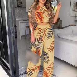 Women’s Two Piece Sets Summer Elegant Solid O-neck Short Sleeve Slim Crop Short Top & Print High Waist Wide Leg Pants Outfits